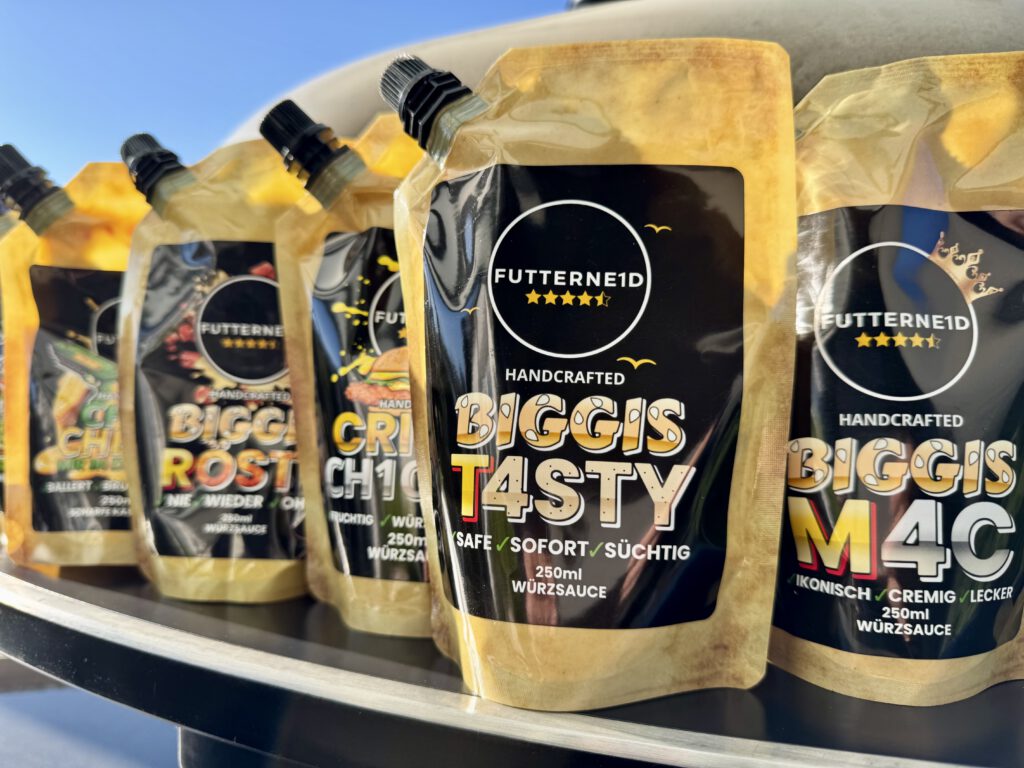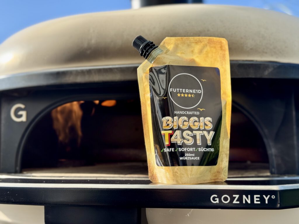 Witziger Typ auf jeden Fall. Er wird in seinen Videos – zumindest mental – von seiner wortkargen Bekannten „Biggi“ begleitet. Sie ist die Namensgebern der heutigen Protagonistin – der sauleckeren Soße „Biggis T4sty“. Und somit tragen die Beiden ihren Teil dazu bei eine profane Pizza im heimischen Wohnzimmer mit einem gewohnten und unverkennbaren Geschmack des glitzernden Schnellrestaurantdinos auszustatten.
