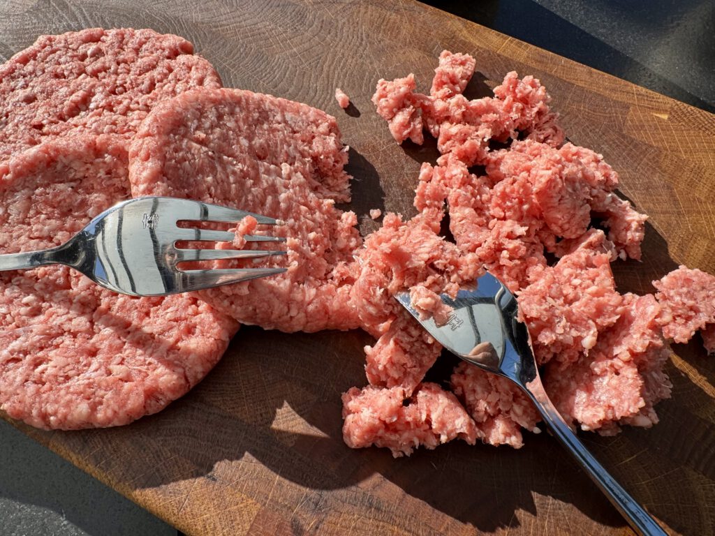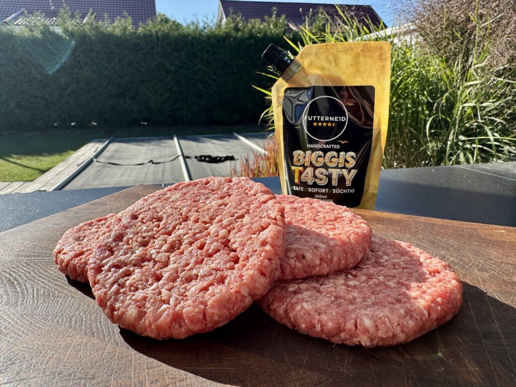 Für eine Pizza, die thematisch an einen Burger angelehnt ist, braucht es natürlich auch Burgerfleisch. Hab es mir einfach gemacht und fertige Rinderpattys besorgt. Die Dinger – und zwar mehrere – ganz auf den Fladen zu legen würde zwar in die von mir so geliebte Kategorie „TOTAL ÜBERTRIEBEN“ gehen, aber das Mundgefühl bleibt dabei doch voraussichtlich auf der Strecke.