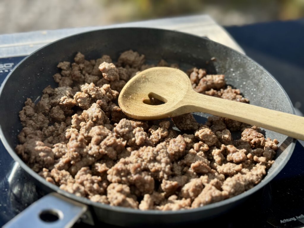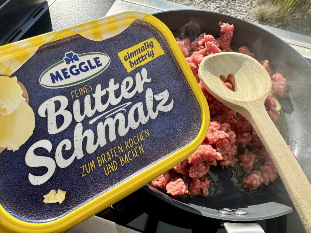 Es folgt eine gemütliche Menge Burgerpattybrocken und eine ebenfalls ausreichende Menge an Zwiebeln.