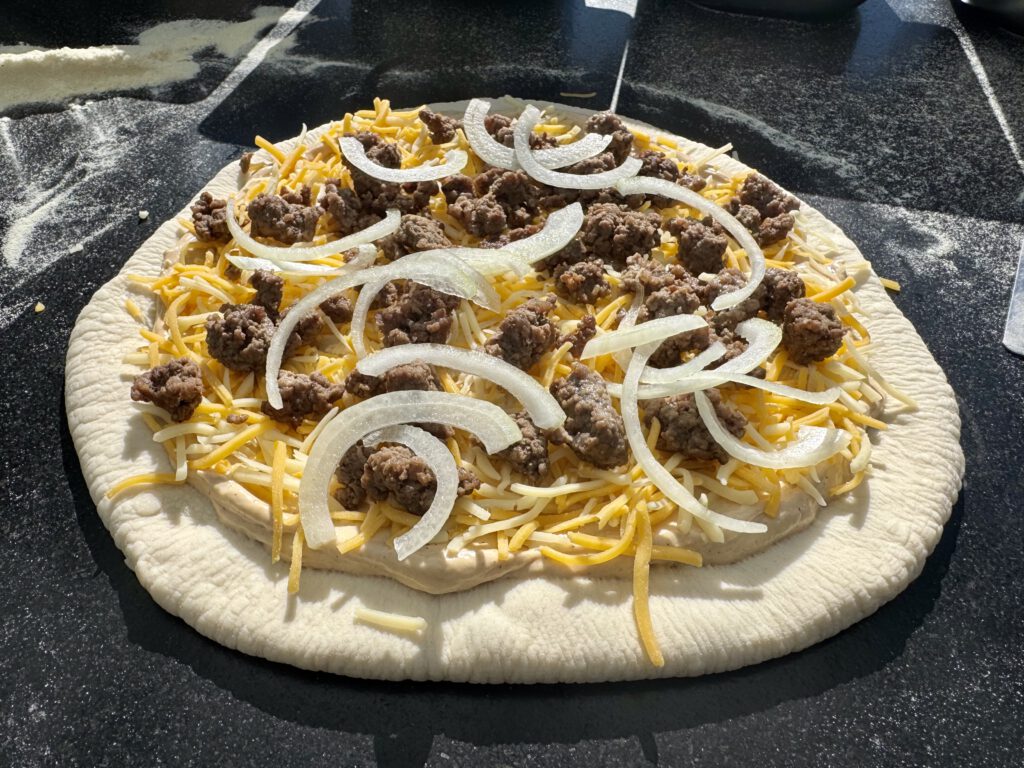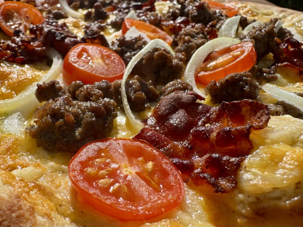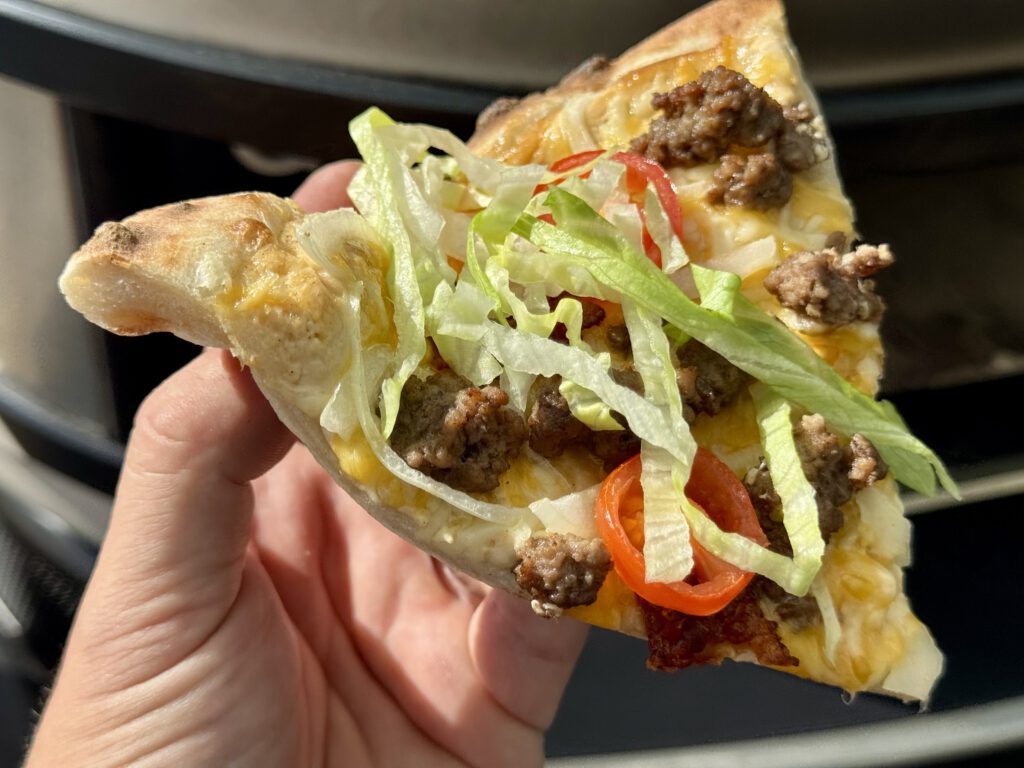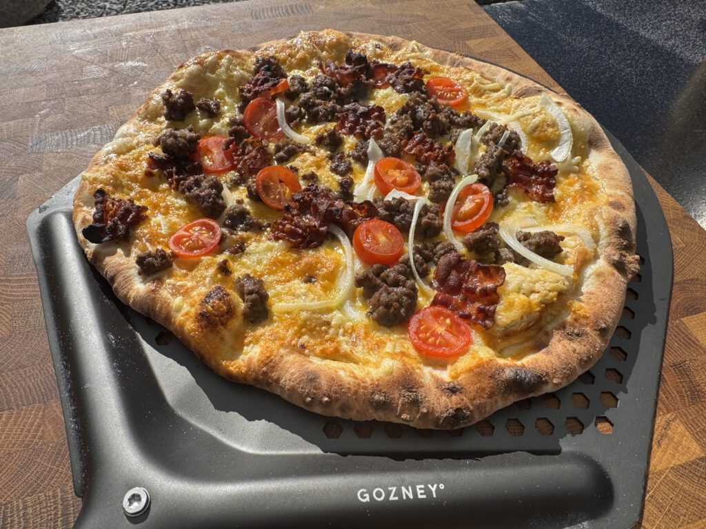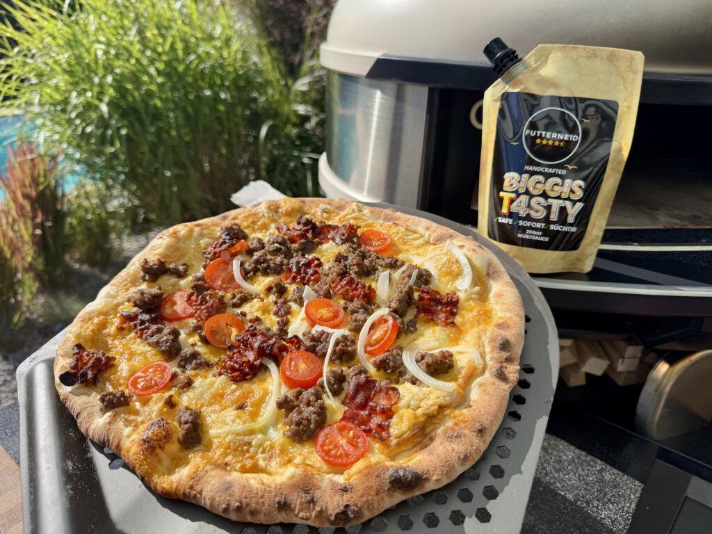 Schmeckt wie das Original, nur flacher. Und flach bezieht sich hier nur auf die Geometrie des Teils. Der Geschmack ist alles andere als flach. Dank der geilen Soße von Futterne1d, dem Bacon, dem Patty, dem Käse und allen anderen Mitwirkenden dieser Pizza bin ich hin und weg – könnt vor Freude in den Tisch beißen. Mach ich in jedem Fall noch mal.